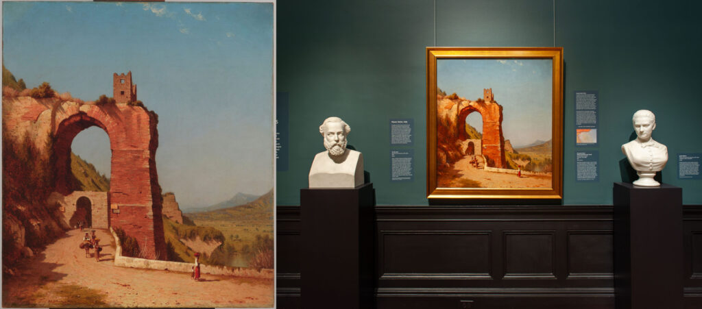 Sanford Robinson Gifford (American, 1823‒1880), The Arch of Nero, 1871, oil on canvas, 45 1/16 × 40 3/16 in. (114.5 × 102 cm). The Walters Art Museum, Baltimore, Bequest of Mrs. Priscilla Ridgely Schaff, 1982, acc. no. 37.2599 after recent treatment (left); installation detail from Selections from the North American Collection: People and Places, 2024. The Walters Art Museum, Baltimore (right)
