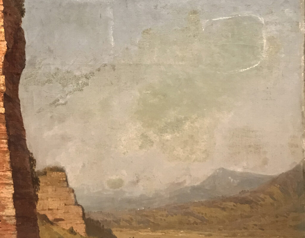 Consequently, The Arch of Nero, cited by Gifford as one of his “chief pictures,”[2] was long out of public view and believed to be lost by scholars until recently. Innovations in conservation materials since prior treatment campaigns, along with singularly focused time during the COVID-19 pandemic, helped to restore the nuanced atmosphere of this once thought-to-be-lost painting. Now, after more than forty years in storage, where it remained between conservation treatments that endeavored to remove the extensive discolored restoration and more sensitively reintegrate damages, it has finally been exhibited at the Walters (Selections from the North American Collection: People and Places, 2024) (fig. 1).
