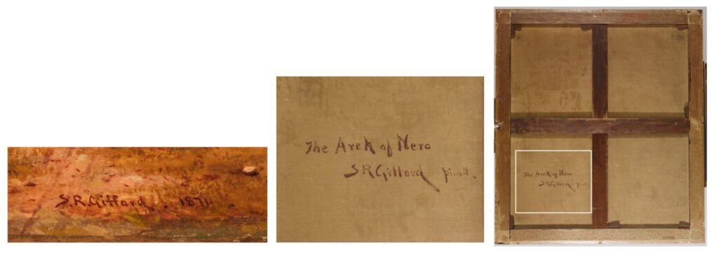 The Walters painting, number 572 in the catalogue, is signed and dated in the bottom left corner in red-brown paint: S.R. Gifford . 1871. On the verso, another inscription by the artist in red-brown paint reads The Arch of Nero/S R Gifford pinxit (fig. 4). It is curious that the date of the Walters painting was listed as “not known” in the catalogue, as it is clearly indicated on the painting, but perhaps that information was not relayed in time for publication by the painting’s first owner. Also, the painting is listed as measuring 41 inches in width and 45 inches in height (the height and the width are denoted in reversed order); however, the painting measures 40 inches in width. The small discrepancy may indicate the original format has changed slightly; however, it is possible that the measurement in the catalogue may have simply been wrong. The latter is most likely true as the dimensions of the two paintings of the arch completed later in the studio compare proportionally; the larger is scaled up 2.5 times the smaller one.[15]