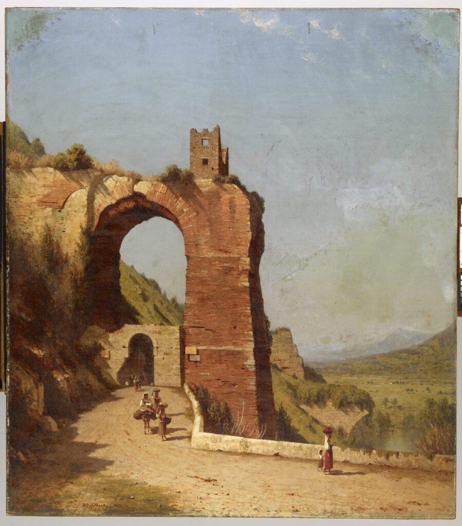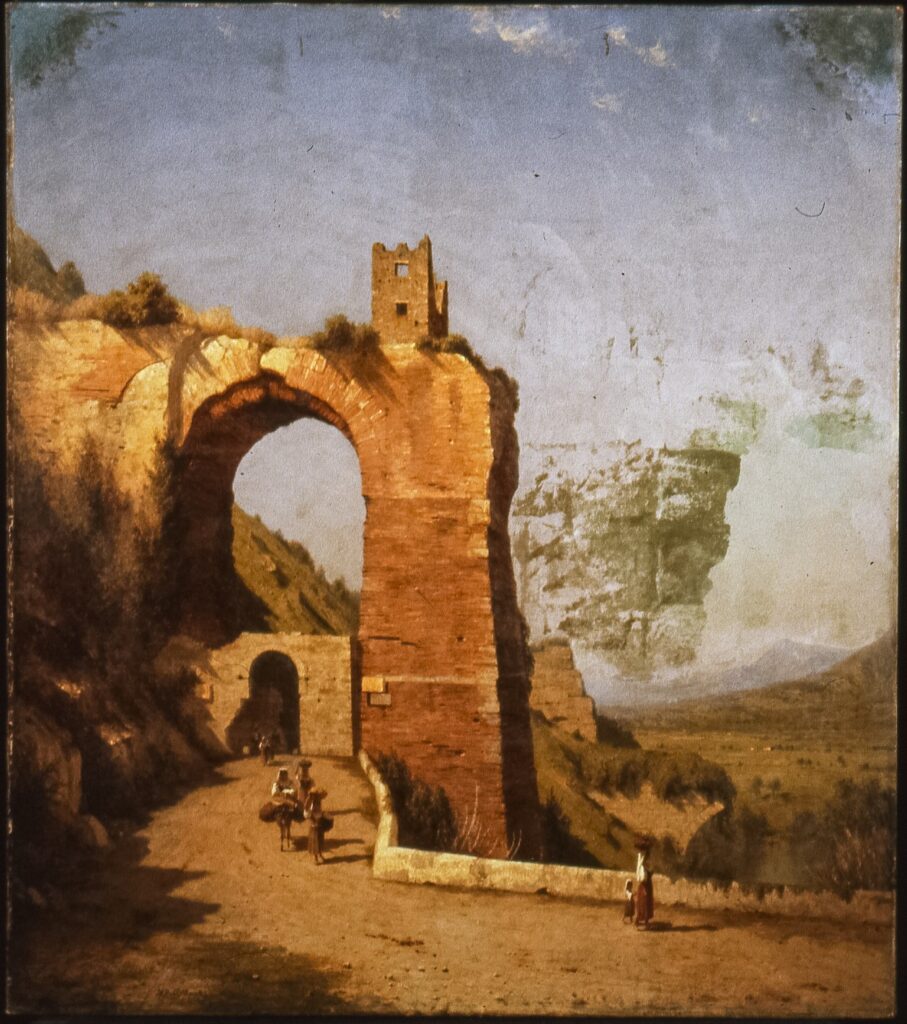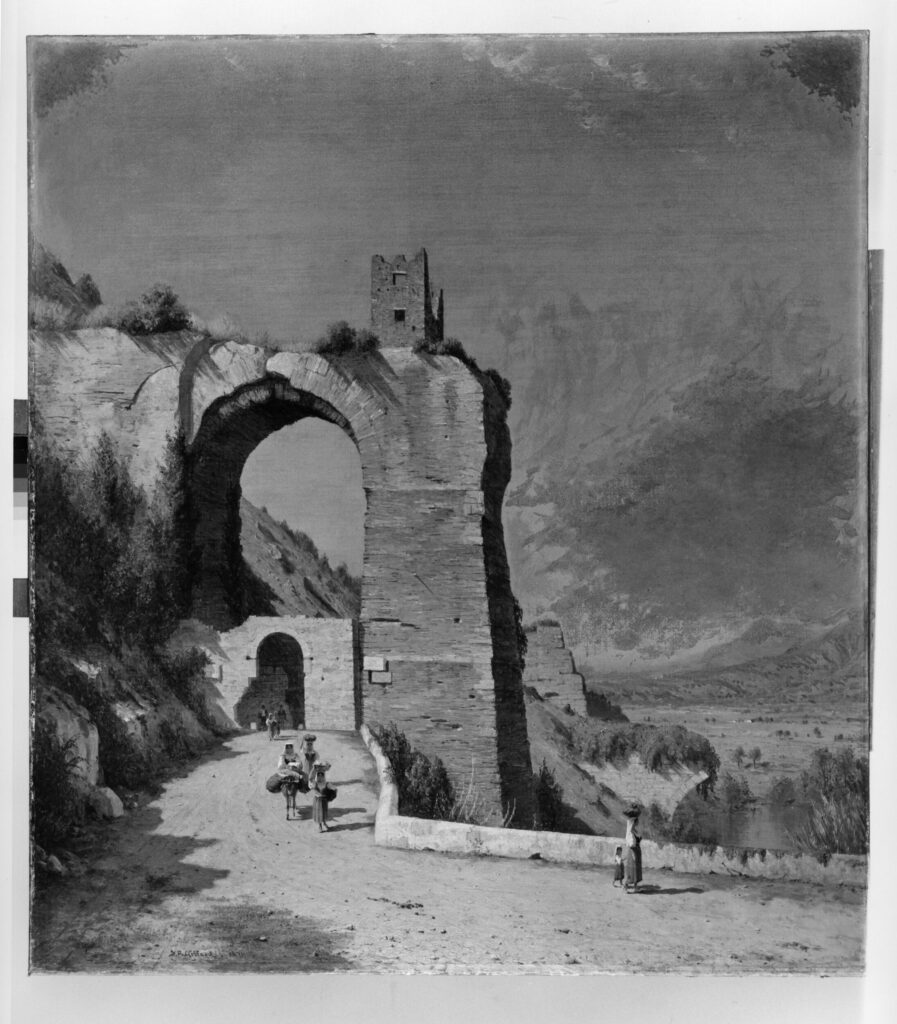 The Arch of Nero depicts an arched fragment of the Roman aqueduct Anio Novus, finished in 52 CE, with part of a medieval tower perched on top.[3] The arch, known as Il Ponte degli Arci, is located just outside of Tivoli. Behind and to the right of the arch is a glimpse of an even older aqueduct, the Aqua Marcia, built between 144 and 140 BCE. The site, which had become erroneously referred to as “Arch of Nero” sometime in the early nineteenth century, had attracted artists in the past, including Claude Lorrain, J. M. W. Turner, and Thomas Cole.[4]
