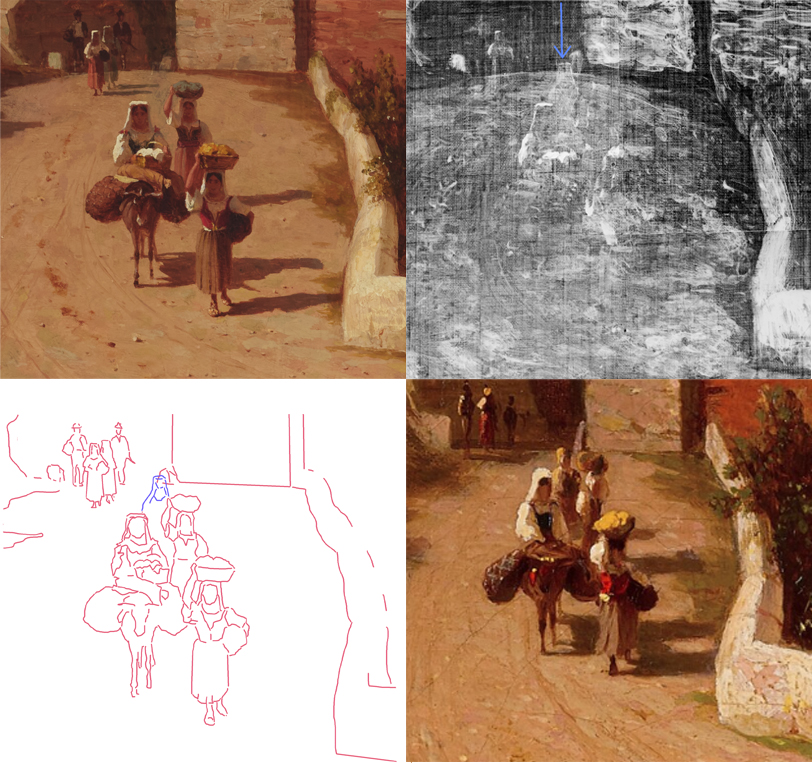 Detail of fig. 1 showing figures coming out of arch (top left); x-ray detail of same area with blue arrow indicating extra figure taken out in final version (top right); tracing of x-ray detail with extra figure delineated in blue (bottom left); corresponding detail of fig. 5, featuring extra figure (bottom right)