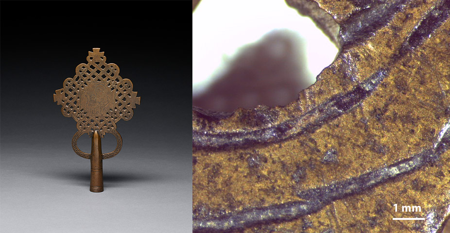 The Walters Art Museum includes within its collection twelve Ethiopian copper-alloy crosses, dating from between the twelfth and twentieth centuries. Eight of these feature what appears to be intentionally applied black material in the engraved designs and punchwork. In advance of the 2023‒2024 exhibition Ethiopia at the Crossroads, these crosses and related historic metalwork from Ethiopian lands were the subject of a technical study that described the presence and appearance of this black material.[1] This black material has only recently been noted in the literature,[2] but until now it has not been subject to analysis nor has its significance been adequately evaluated.
