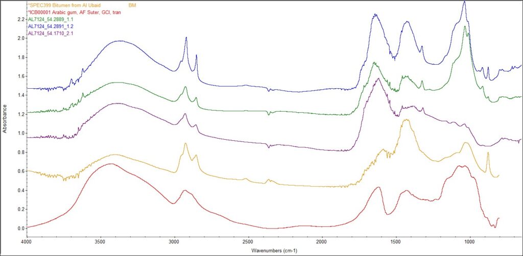 None of the samples contained carbohydrates. GC-MS did not confirm the identification of gum arabic in instances where FTIR had peaks that could be interpreted as either gum arabic or bitumen.