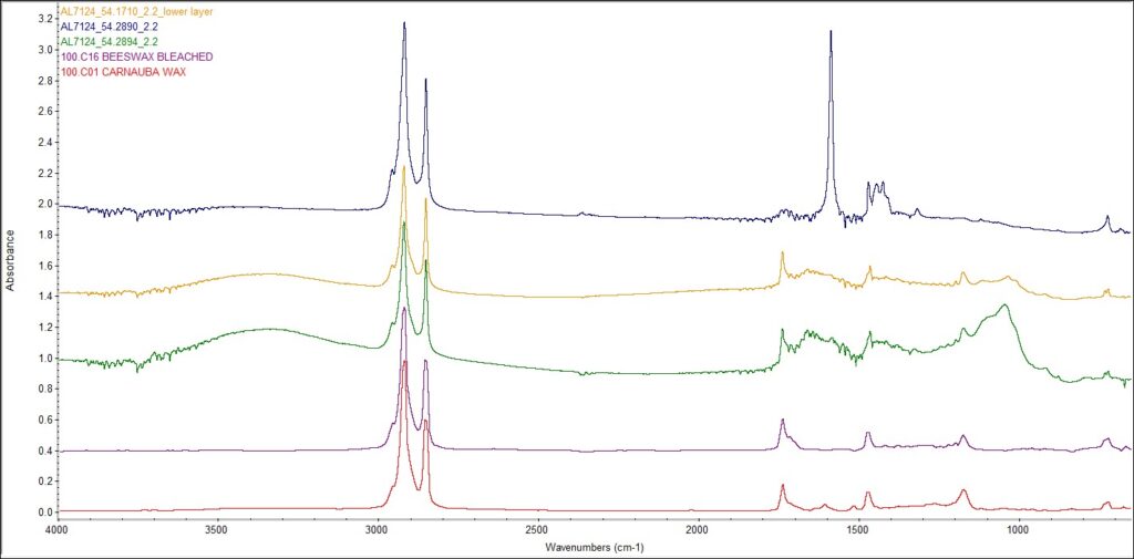 FTIR analysis of lower layers of samples from crosses 54.1710, 54.2890, and 54.2894 compared to reference spectra of waxes