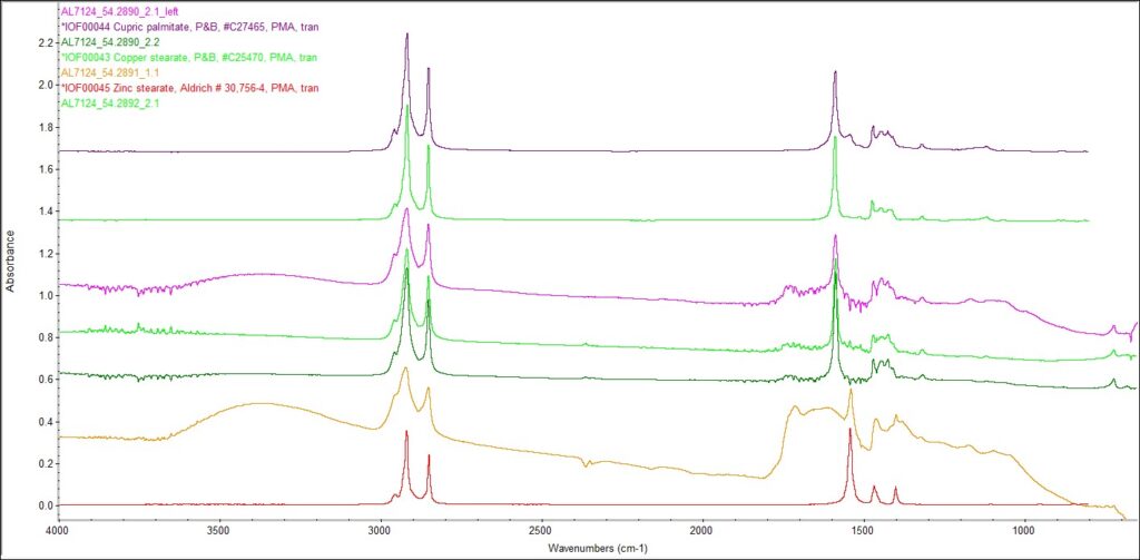 FTIR analysis of samples from crosses 54.2890, 54.2891, and 54.2892 compared to reference spectra of metal soaps copper stearate, cupric palmitate, and zinc stearate