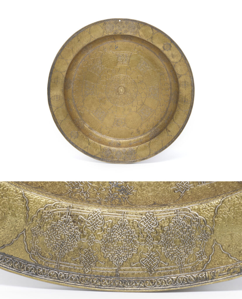 Mahmud ibn al-Kurdi, Salver, Iran, late 15th century, brass, gilded and inlaid with silver, H: 2 1/4 × Diam: 19 1/2 in. (5.7 × 49.5 cm). The Walters Art Museum, Baltimore, Acquired by Henry Walters, 1927, acc. no. 54.527