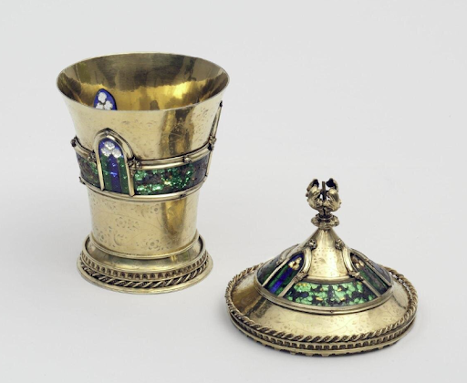 Unidentified artist, The Mérode Cup (cup and cover), ca. 1400, silver, silver gilt, gold, plique-à-jour enamel plaques, H: 3 15/16 × Diam: 6 7/8 in. (17.5 × 10 cm). The Victoria and Albert Museum, London, acc. no. 403:1, 2-1872
