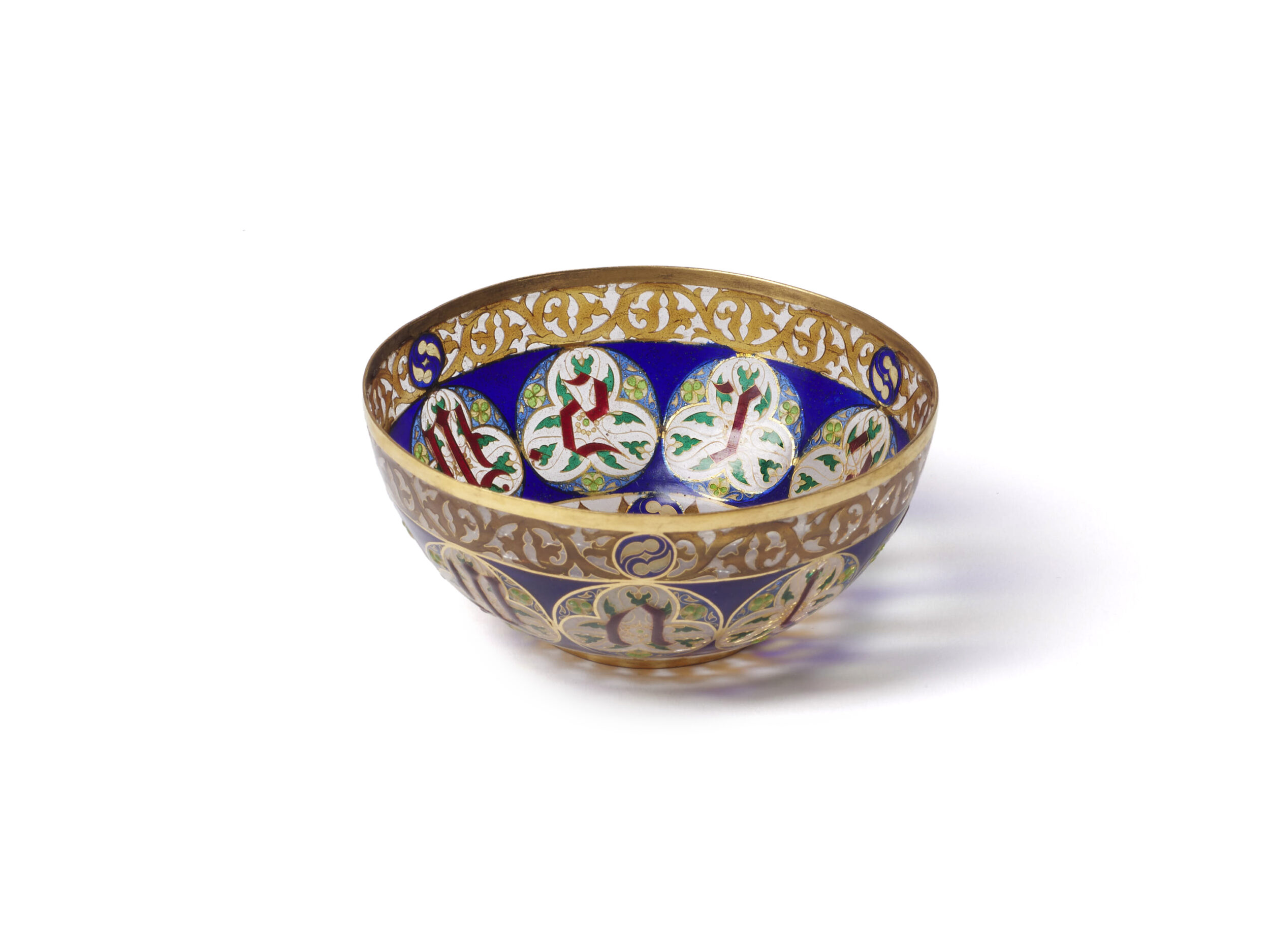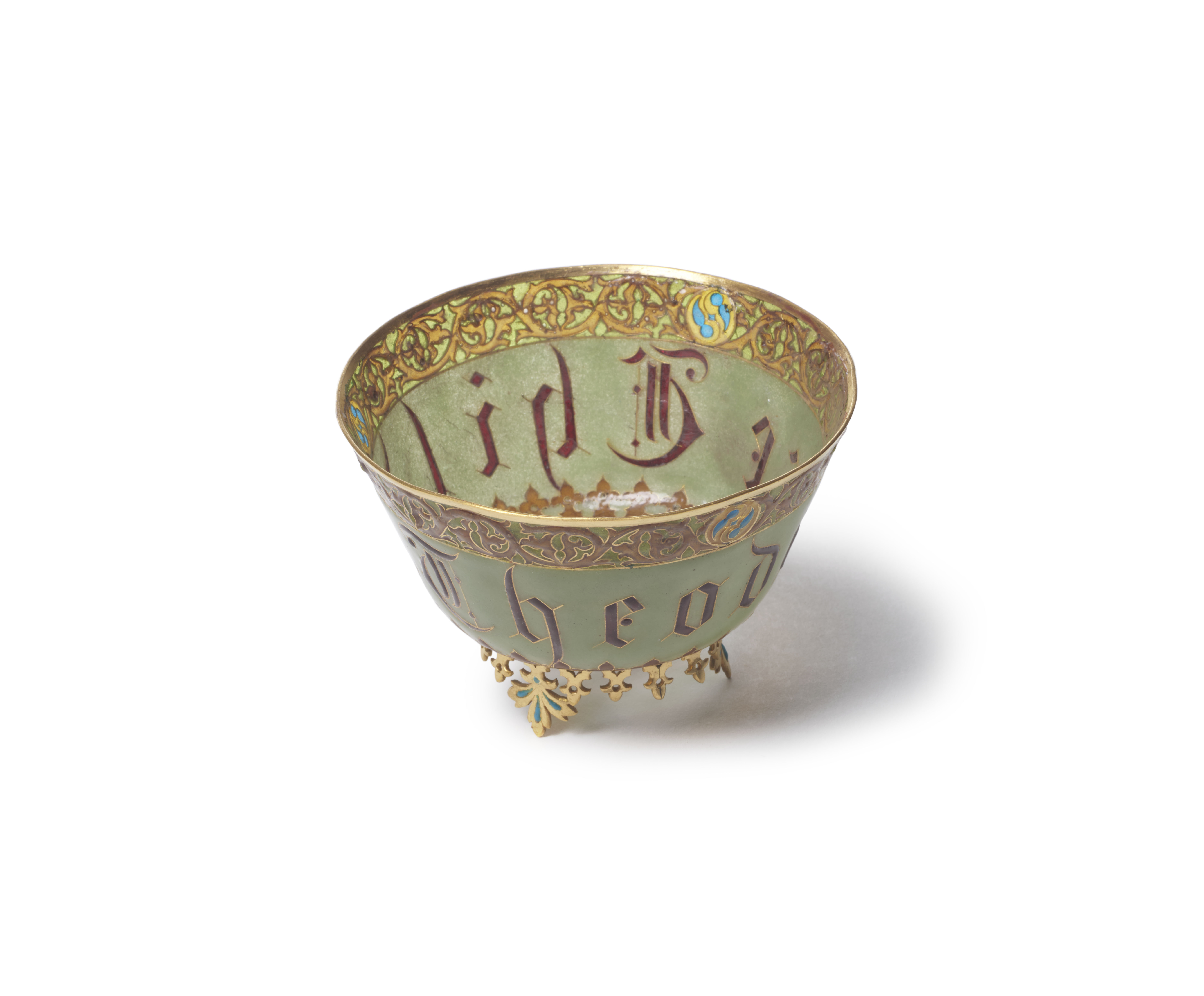 Turning first to the cup decorated with letters spelling out “W. T. Walters” (fig. 3), it, like the cup with the name “Theodore Child,” is unusual in that it is inspired by Gothic, rather than Islamic or Asian, art. Each red letter appears within a white trefoil, which is framed within blue circles. These circles and trefoils are further subdivided with extremely fine wires and cells in light and dark green enamel, a technique that is not repeated elsewhere in Thesmar’s work but resembles the handling of the transparent enamel panels in sections of the Mérode Cup. An article from March 1888 titled “A Wonderful Enamel—A New Treasure of the Walters Collection” published in the Baltimore American includes the cup, so it must predate this.[21] The anonymously authored article, which misspells Thesmar’s name as Tismar, recounts that the cup was fired ten times, with more enamel being added each time to fill the gaps in the metal framework, and that the work “occupied eight months,” so presumably it had begun in 1887 at the latest.[22]